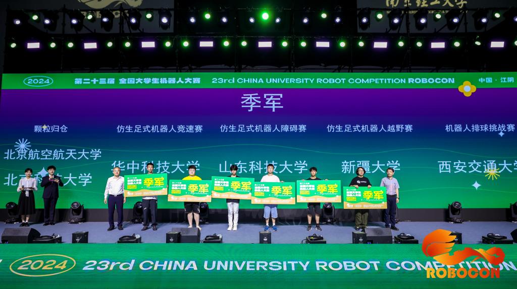 由机电学院学生吴思远、王锦程、马豪阳等组建的“小平科技创新团队.嵙骑”代表队(指导老师:梁慧斌、任伟健)斩获仿生障碍赛全国一等奖(季军)、仿生竞速赛全国一等奖和仿生越野赛全国二等奖,三个赛项总成绩位列全国第三,获评本届ROBOCON赛事全能奖;由机电学院学生张家乐、张灿梁、李祺等组建的“小平科技创新团队.嵙骏”代表队(指导老师:梁慧斌、宋阔)获得仿生障碍赛和仿生越野赛全国一等奖、仿生竞速赛全国二等奖;由自动化学院学生杨洋、张宇、张淋皓等组建的“BB贝博艾弗森官网OVERTURN战队”代表队(指导老师:崔保春、蒋忠贇)获得ROBOCON主赛项颗粒归仓全国三等奖、颗粒归仓操作赛项全国二等奖、机器人排球赛项全国二等奖、仿生足式障碍赛全国二等奖、仿生足式竞速赛全国三等奖。