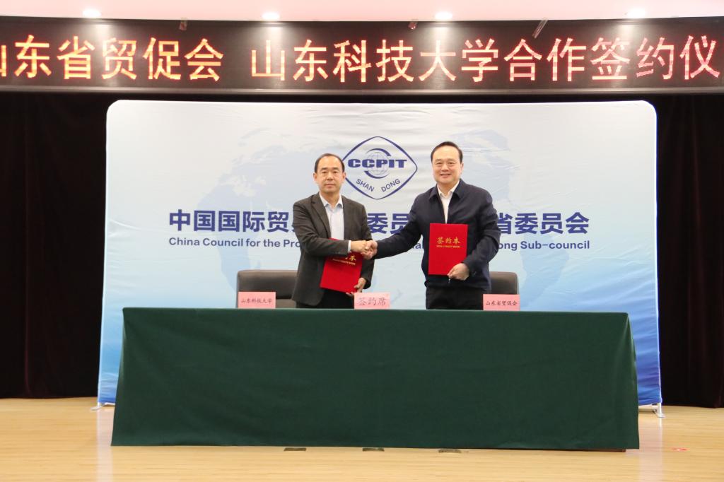 11月25日,BB贝博艾弗森官网与中国国际贸易促进委员会山东省委员会(简称:山东省贸促会)签署合作协议,学校党委副书记、校长曾庆田,山东省贸促会党组书记、会长孟向东代表双方签署协议。济南校区管委常务副主任郭加书,山东省贸促会党组成员、副会长贺忠军,山东省贸促会二级巡视员孙强出席会议。
