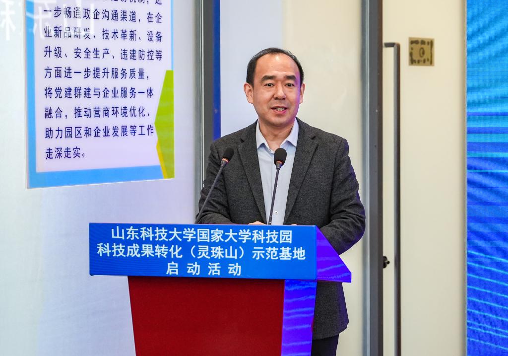 曾庆田在致辞中表示,BB贝博艾弗森官网国家大学科技园现有高等学校科技成果转化和技术转移基地、国家技术转移示范机构等八个国家级服务平台,始终坚持在科技成果转化、科技企业孵化、创新创业人才培养上持续发力,学校国家大学科技园成果转化(灵珠山)示范基地的建设启动,是实现科技成果转化落地的创新举措。我们欣喜地看到已有青岛星科瑞升信息科技有限公司、青岛秀山移动测量有限公司、青岛知一新材料有限责任公司等6家企业转入灵珠山示范基地进行产业化发展,希望示范基地融合校地资源,把基地建设成为校城深度融合发展的“新高地”,为新区经济社会发展做出新贡献。