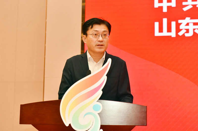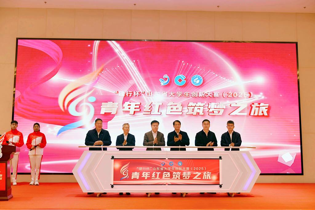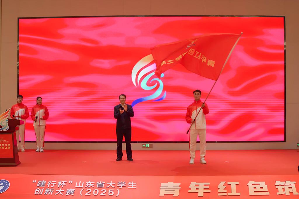 活动现场,与会领导共同启动“建行杯”山东省大学生创新大赛(2025)“青年红色筑梦之旅”活动。山东省教育厅高等教育处处长曾宪文为学生代表出征授旗。