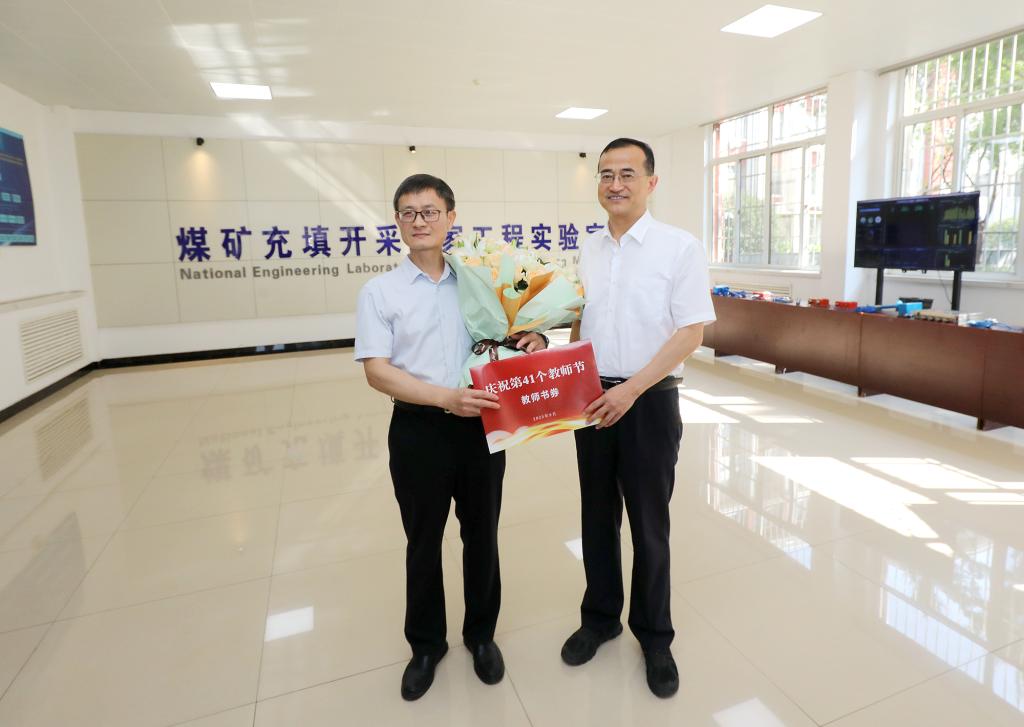 座谈结束后,李兰祥现场听取了学校服务地方发展情况介绍,参观了煤矿充填开采国家工程实验室和学校部分科技成果实物展示,并向教师代表、智能装备学院院长彭延军教授赠送了鲜花和书券。