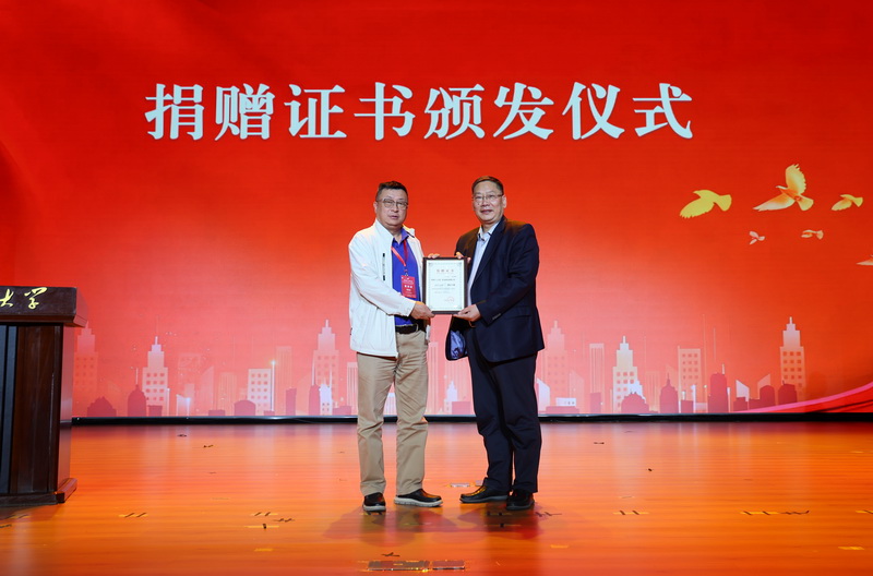 诸葛福民向捐赠单位代表、尤洛卡精准信息工程股份有限公司总经理黄屹峰颁发了捐赠证书。黄屹峰表示,企业的成长和发展离不开社会的滋养和学校的支持,希望学院薪火相传、再创辉煌。