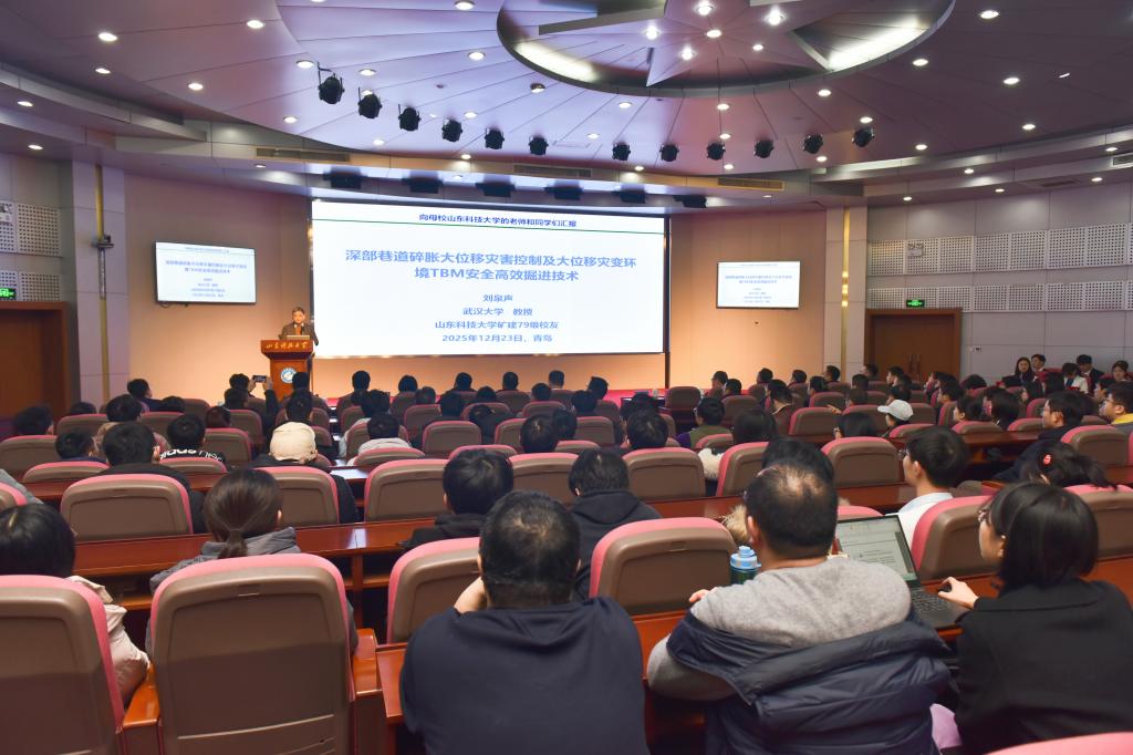 报告会上,刘泉声院士分享了他在深部巷道围岩稳定性控制领域深耕数十年的成果与体会,系统阐述了深部煤炭资源开发战略需求和深部巷道大变形灾害防控难题,详细介绍了巷道米级大变形灾变过程监测模拟技术和碎胀运动机理、分步联合控制理论及成套技术、TBM安全高效成巷关键技术三方面的研究成果及工程应用,整场报告内容翔实、思想深刻,引发在场师生的强烈共鸣。