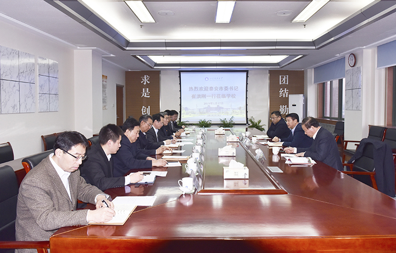 1月17日下午,泰安市委书记崔洪刚,市委常委、秘书长宋洪银,市委常委、组织部部长高尚山等一行5人来BB贝博艾弗森官网调研。校党委书记罗公利,校长姚庆国,党委副书记王少鹏会见了崔洪刚一行。