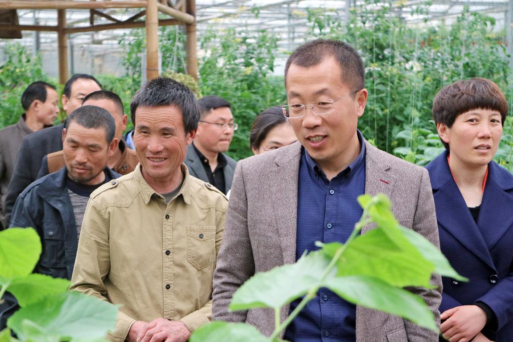 “第一书记”在察看大棚蔬菜生长情况
