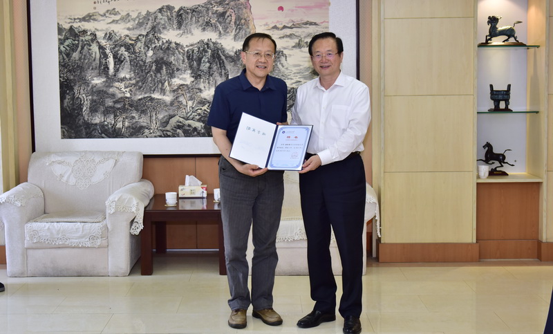 校党委书记罗公利、副书记尹华会见了田力普一行。罗公利代表学校为田力普、张跃进颁发了兼职教授聘书,并与田力普一行进行了座谈交流。