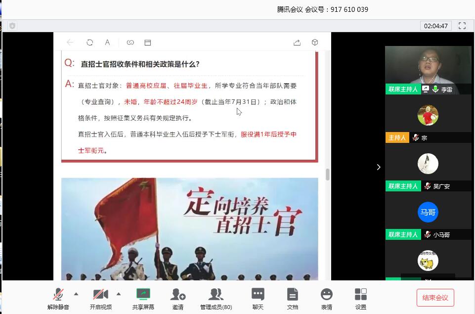 以思想领航,切实做到参军理想入脑入心。疫情期间,BB贝博艾弗森官网扎实抓好线上思想政治教育和国防教育,组织全体学生观看《全国大学生同上一堂疫情防控思政大课》,为每位同学推送大学生国防教育推文,推选国防大学、国防科技大学军事专家为学生讲授的线上国防教育专题讲座,引导学生树立崇军拥军价值观。举办参军入伍先进事迹网络报告会,邀请四名考入军校的同学做客“青春讲堂-成长在军营”网络课堂,强化学生爱国担当精神,切实做到征兵信息入眼入耳。重点做好毕业生参军入伍宣传动员工作。举办全体毕业生辅导员征兵业务网络培训会,为其整理推送毕业生参军入伍条件、优惠政策,使其成为应征入伍宣传员。组织毕业生参军入伍网络直播宣讲会,为毕业生算清参军入伍政治账、经济账、前途账、成才账、荣誉账,从思想上为其树立参军入伍是依法履行义务、服务国防的高尚行为,是人生发展过程中的宝贵财富,也是一种高级就业行为。