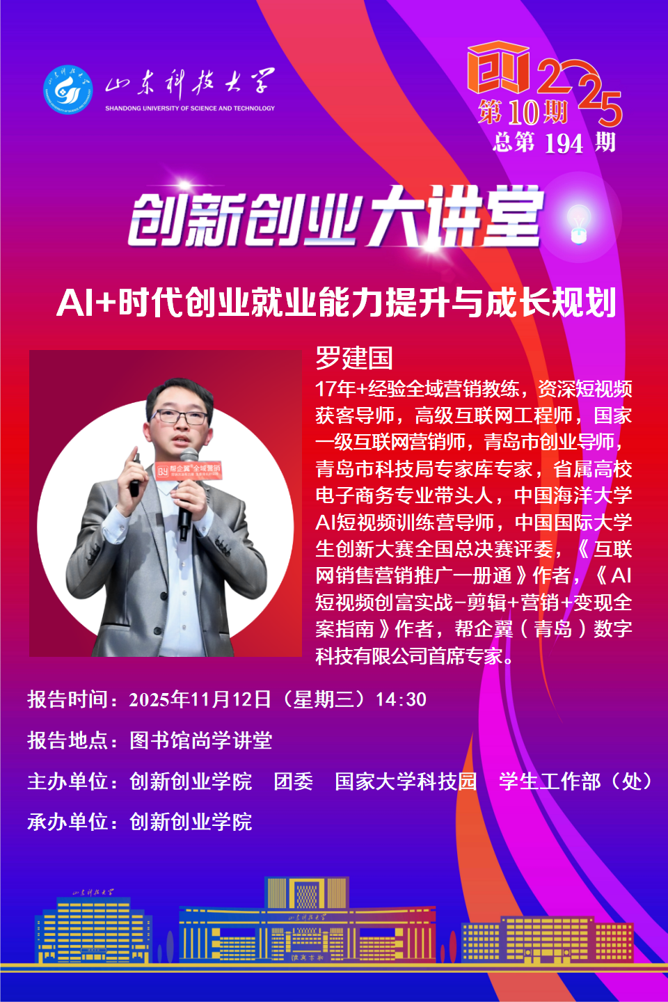 创新创业大讲堂2025年第10期总第194期:AI+时代创业就业能力提升与成长规划