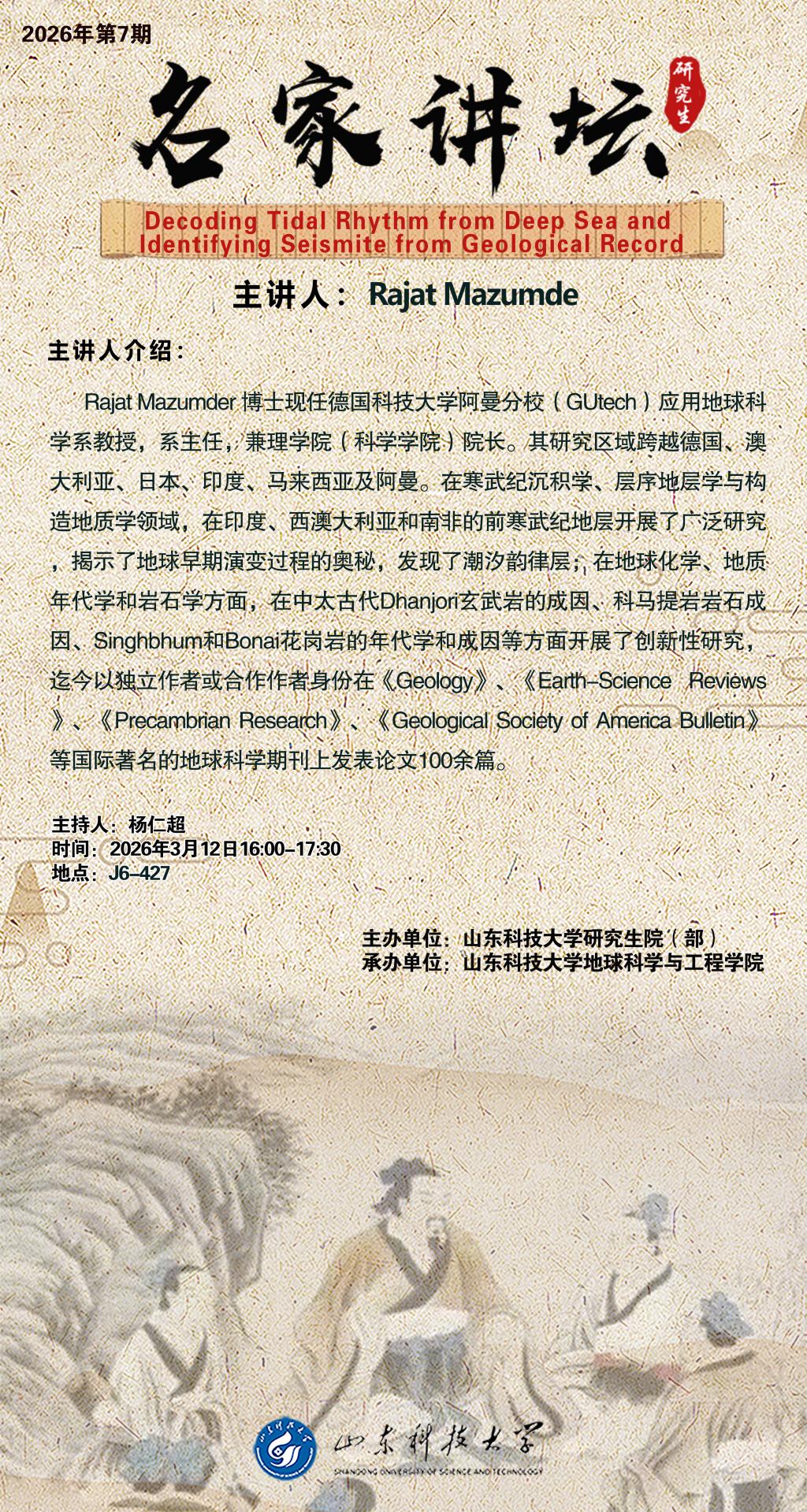 “名家讲坛”2026年第7期:Decoding Tidal Rhythm from Deep Sea and Identifying Seismite from Geological Record(总1109期)