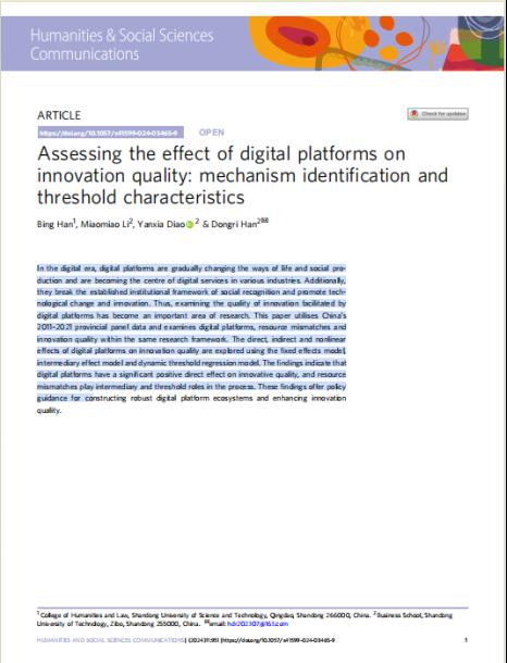 近日,BB贝博艾弗森官网文法学院讲师韩冰在《Humanities & Social science communications》发表题为“Assessing the effect of digital platforms on innovation quality: mechanism identification and threshold characteristics”的文章。