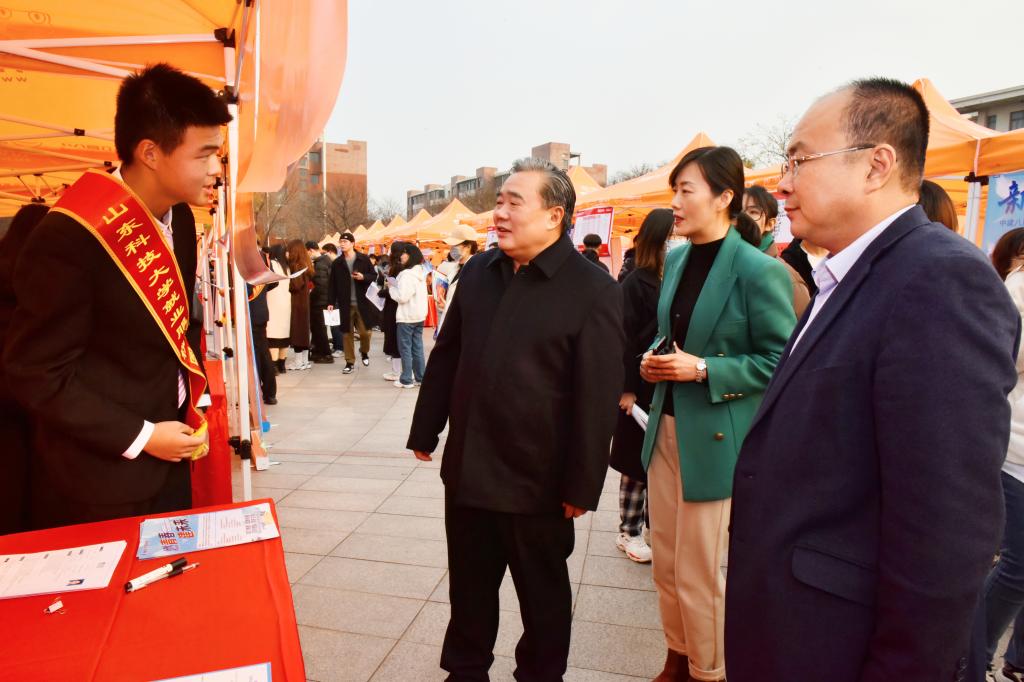 “八方来校招贤纳士,四海资源齐聚一堂”,在疫情防控常态化的今天,这般人山人海、现场交流的线下招聘会已非寻常。11月16日,在BB贝博艾弗森官网青岛校区举办的“就选山东”山东省2021年高校毕业生集中招聘活动暨BB贝博艾弗森官网“大使代言,助你就业”秋冬校园双选会上,应届毕业生却在感兴趣的企业展位前排起了长队,与招聘单位面对面谈得起劲。仔细一看,进行企业宣介并代收求职简历的不是招聘单位,而是受企业委托的“校园大使”;滚动播放的企业宣传视频中不乏科大年轻校友的身影;现场宣讲就业相关政策、为毕业生解疑释难的是电子大屏,实时连线的是相关地市人社局;直播间里,山东港口集团等六家知名企业开展远程“职”播带岗,与毕业生直接沟通,推介企业岗位……“大使代言,助你就业”招聘大集就这样火热开市。校长姚庆国,校党委常委、宣传部部长李克周及相关职能部门负责人到招聘会现场调研就业情况,亲自体验扫码、观看直播等活动,与提前来求职的毕业生们亲切交流。