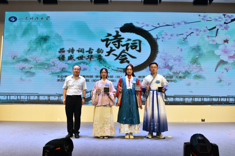 5月28日,BB贝博艾弗森官网人文素质教育中心成立仪式暨“品诗词古韵 谱盛世华章”诗词大会举办。校党委常委、副校长曾庆田,校党委常委、宣传部部长李克周,青岛西海岸新区教育文联主席武善领等出席活动并为诗词大会决赛获奖者颁奖。
