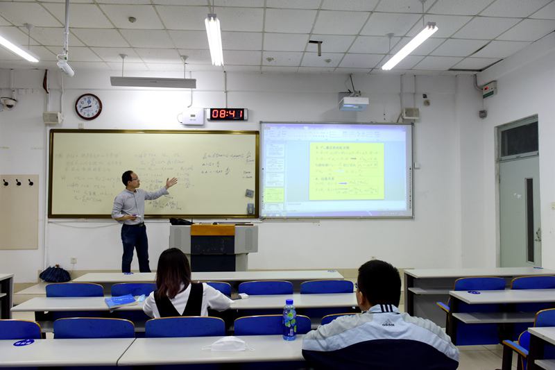电信学院的刁大生老师给2018级应用物理专业同学上《电磁学与电动力学》专业课。刁大生笑着告诉记者:“我是给应用物理专业大二同学们上课,由于有的同学没有返校所以来课堂上上课的是两位同学,分别是是周晓英、刘朝旭。感觉是一对二的 “私教课”,这样对他们俩来说,更不敢不认真听讲了。其他没来的同学是通过观看网上直播学习的。”
