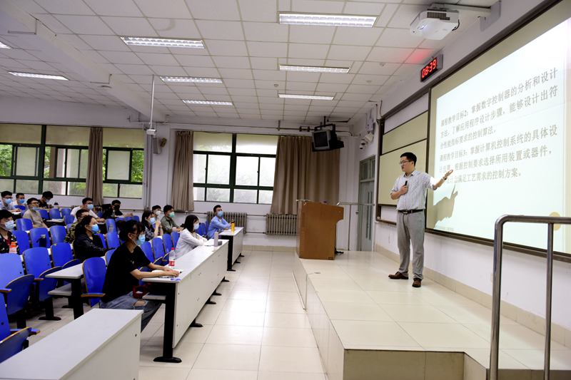 6月10日上午,电气与自动化工程学院盖文东老师在1号教学楼阶梯教室为2017级自动化专业学生上《计算机控制技术》专业课。他说:“我们这节课快结课了,线下课已经上过几次了,能在校园里师生相见大家都很高兴。感觉和同学们面对面交流教学效果更好一些。今天下雨了,同学们仍然都整整齐齐的按照要求来上课。”